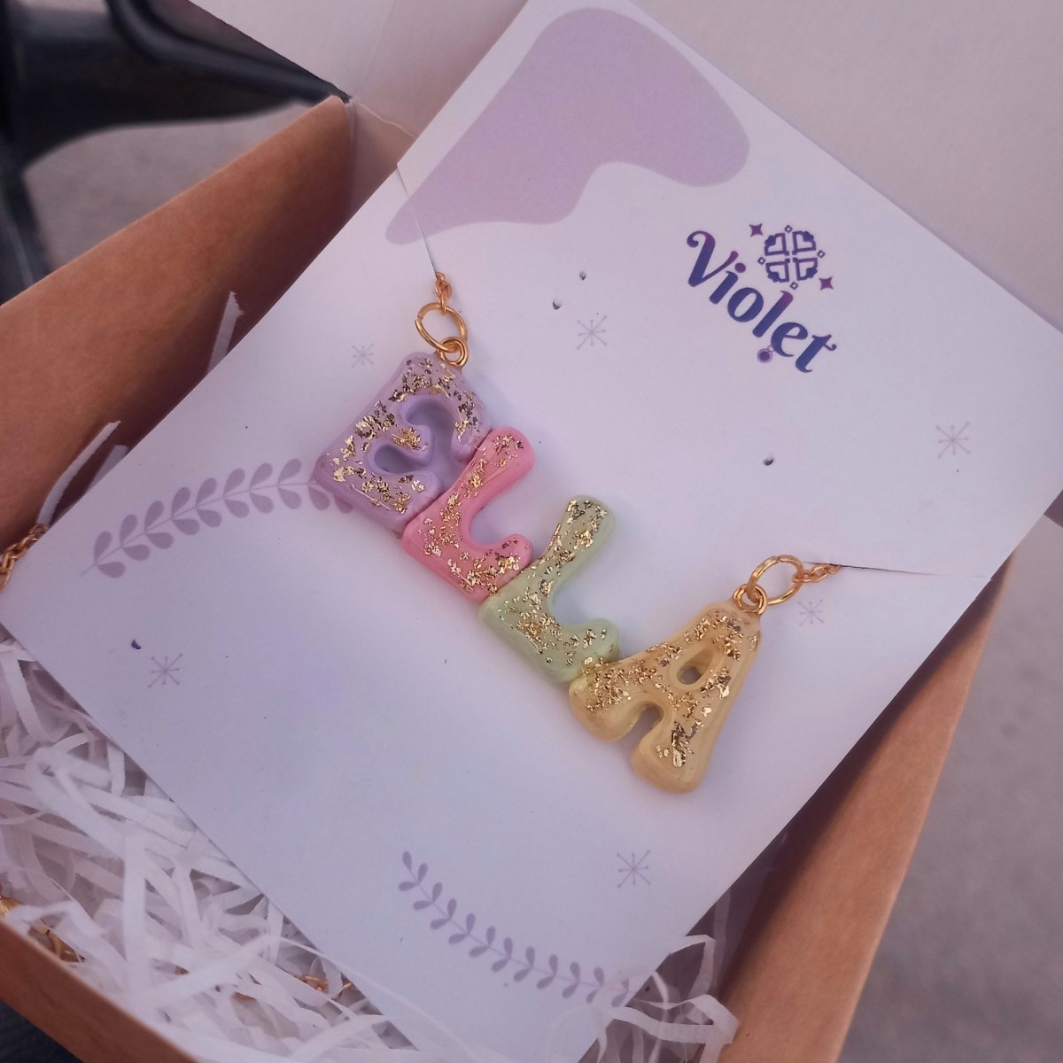Name necklace and medal made of polymer clay. Coated with a layer of resin on both sides for protection and a shiny look. With metal parts made of stainless steel that is rust-proof and hypoallergenic (22cm) length "Available in any colors you like and with elements of your choice"