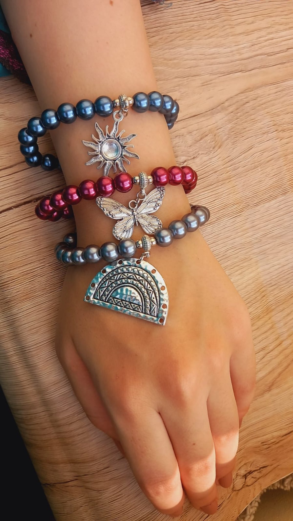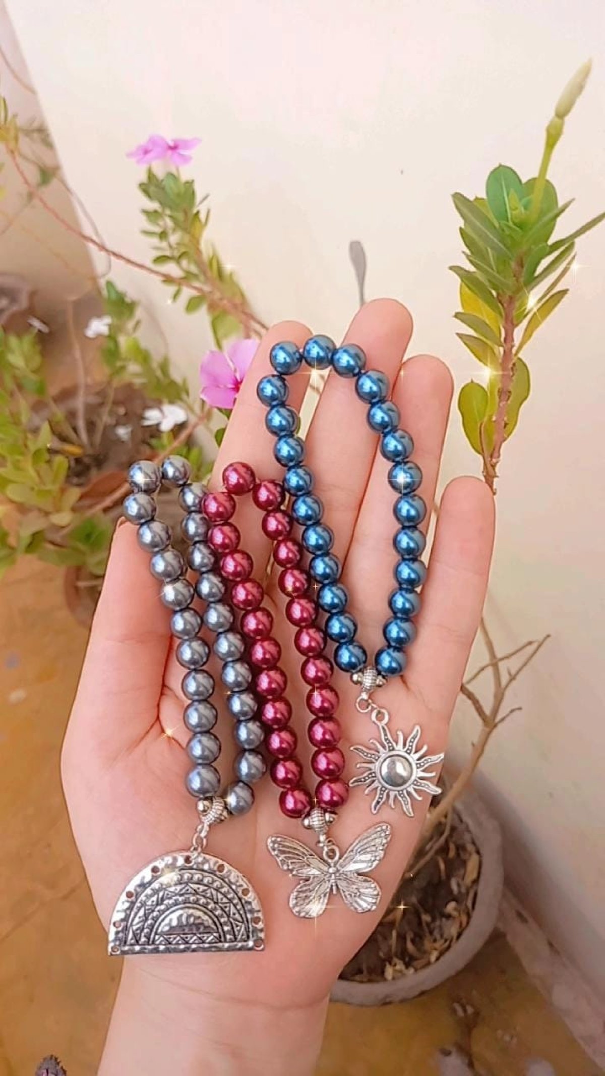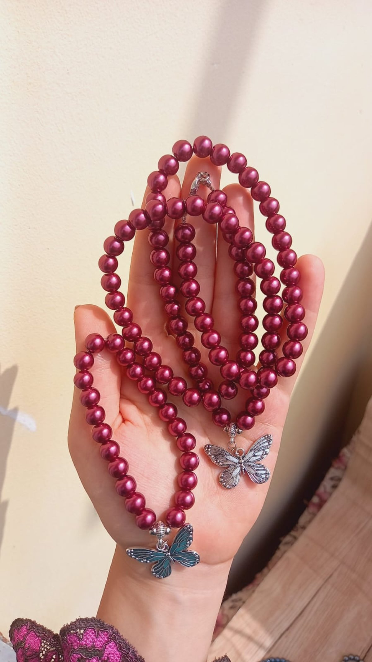 Burgundy jewelry necklace and bracelet A multi-colored necklace for lovers of simplicity, with light and delicate pendants Burgundy tulle necklace and butterfly pendant The length of the necklace can be controlled through the lock, and different lengths are available upon request The necklace is equipped with a lock to facilitate wearing it or wearing a multi-length bracelet on the hand