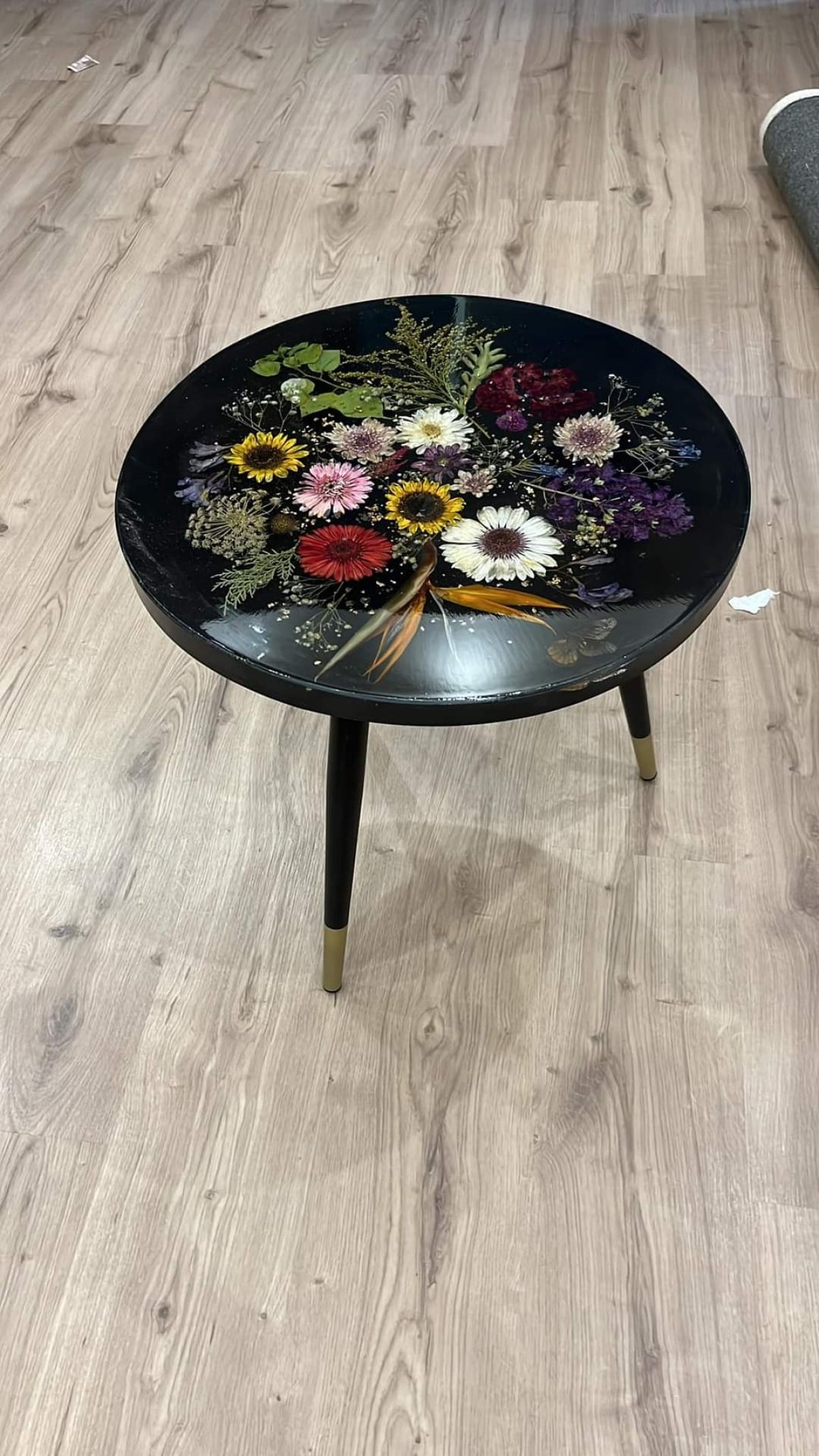 Table made of beech wood, resin and dried roses, diameter 55 cm