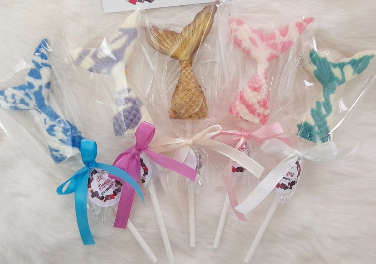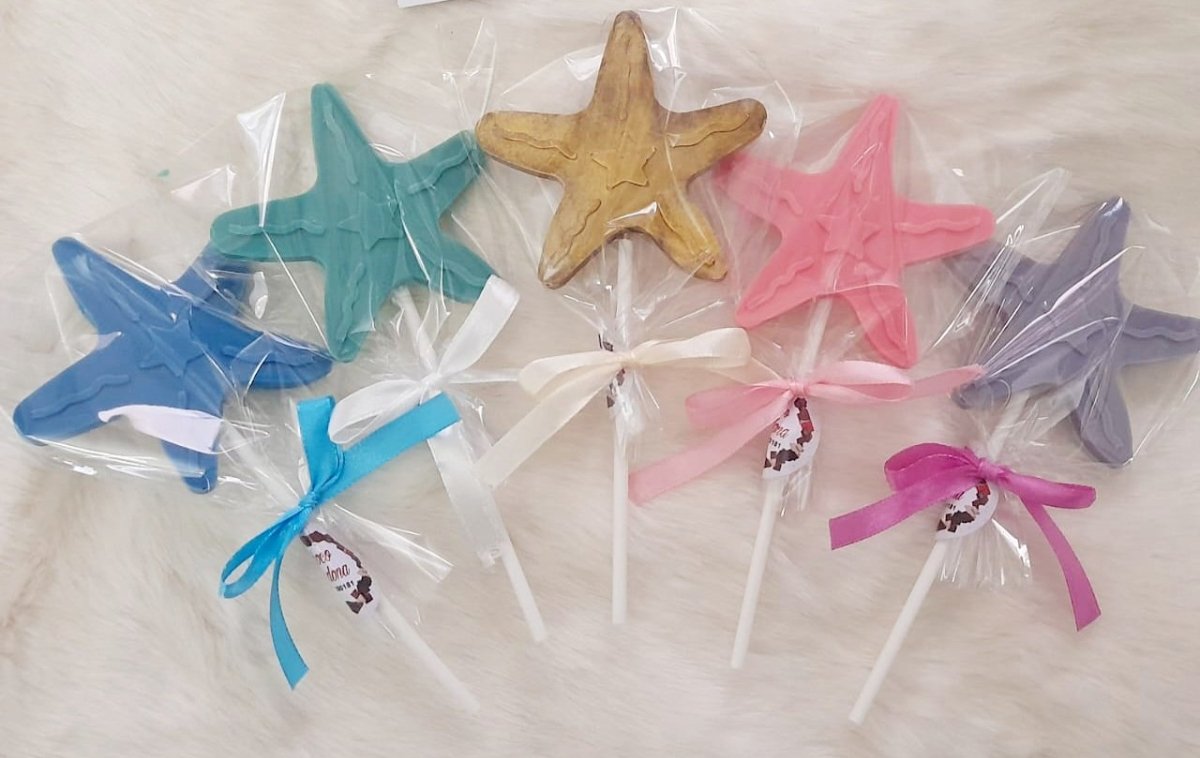 A chocolate lollipop in beautiful sea shapes and different colors. The weight of the piece is about 12 grams. The price is per piece.