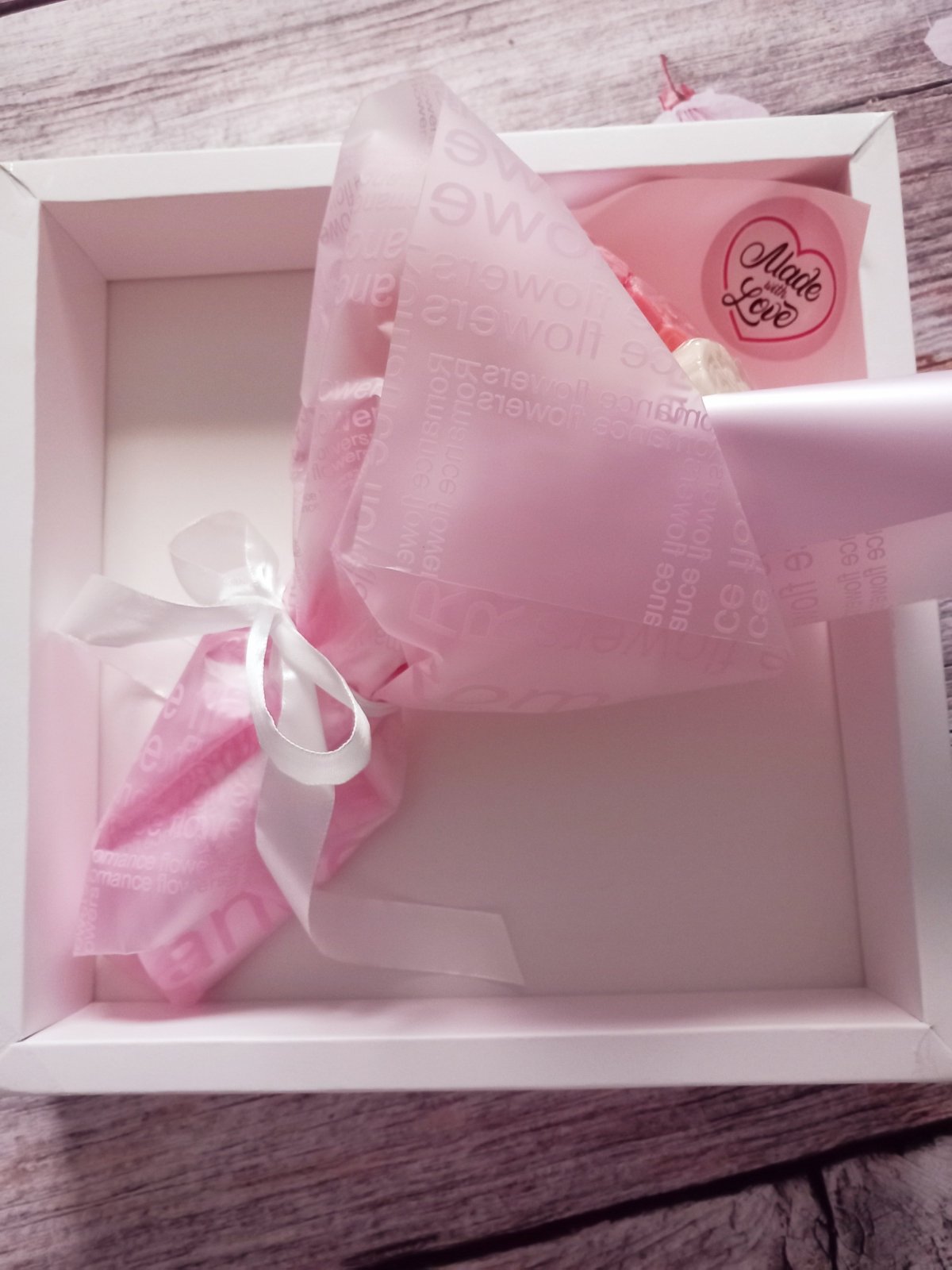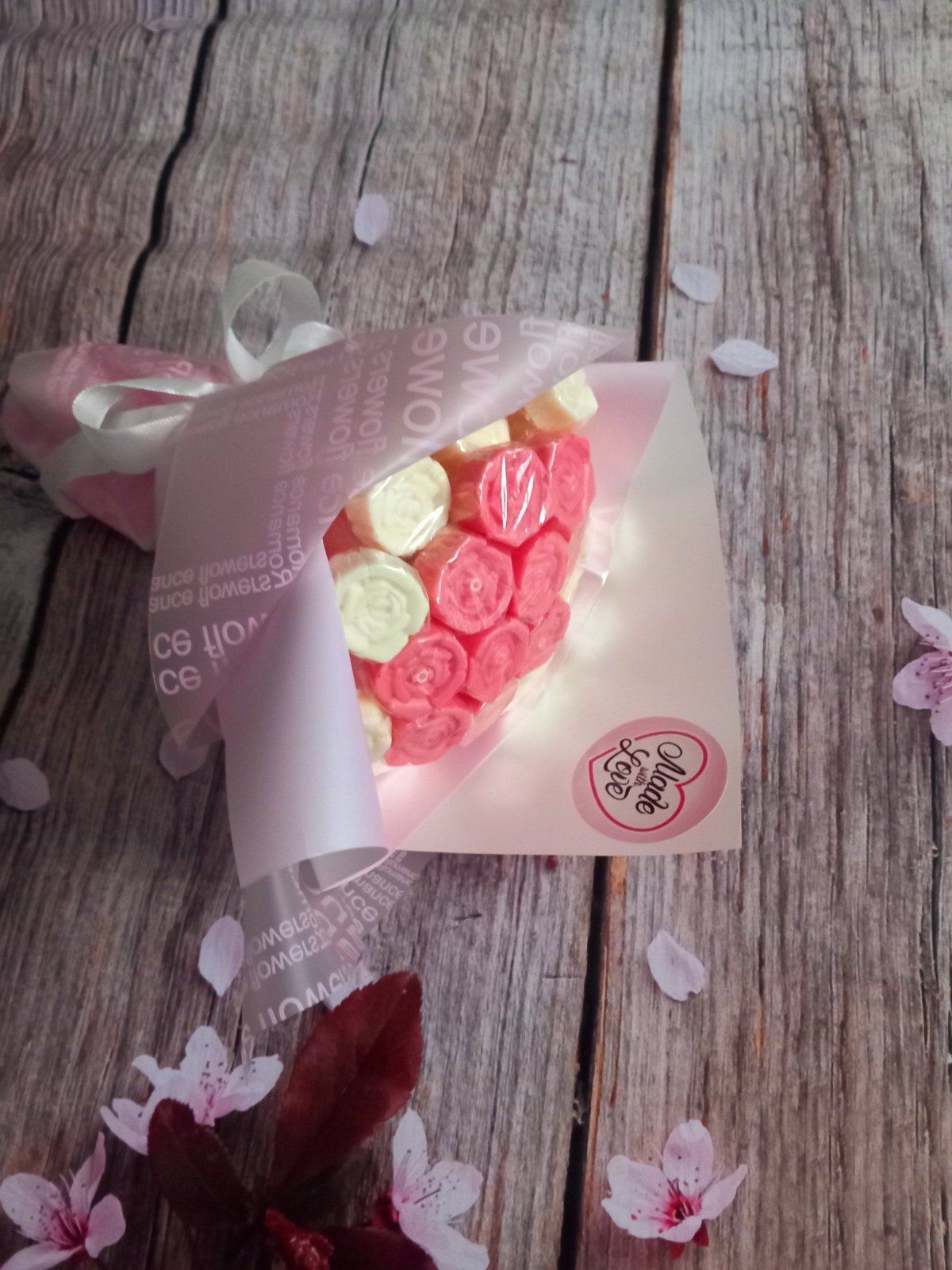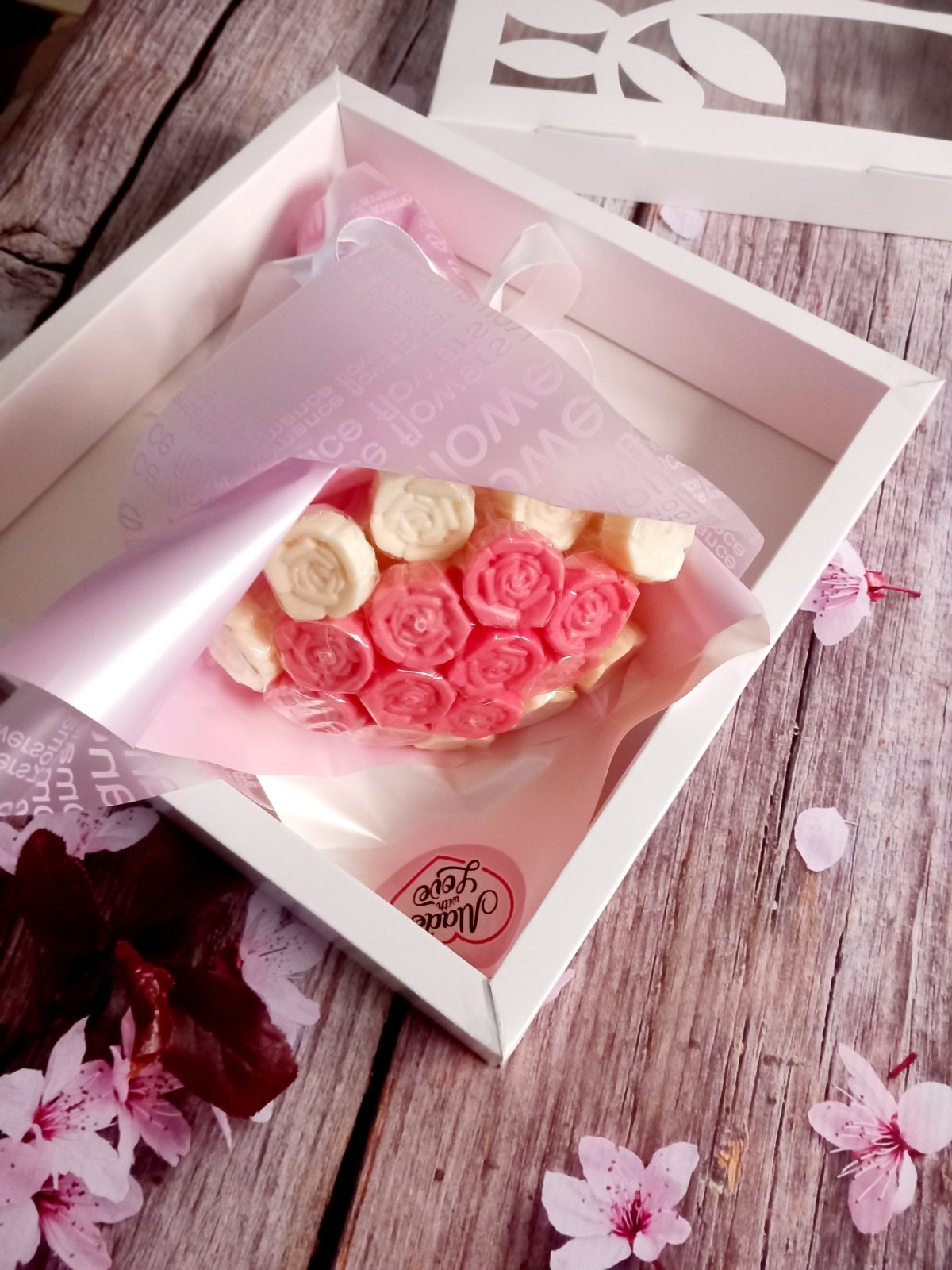 A chocolate rose bouquet made of colored white chocolate, naturally chic, consisting of 20 roses, each weighing 12 grams.