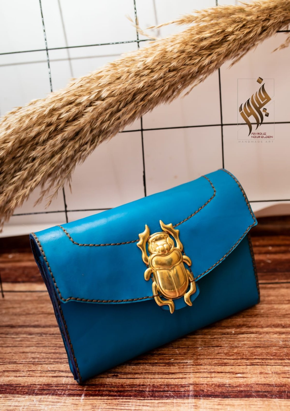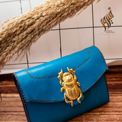 A completely natural leather bag, with a piece-by-piece addition of a unique three-dimensional brass ornament that represents the Nile in the Pharaonic editorial field. It is considered a masterpiece.