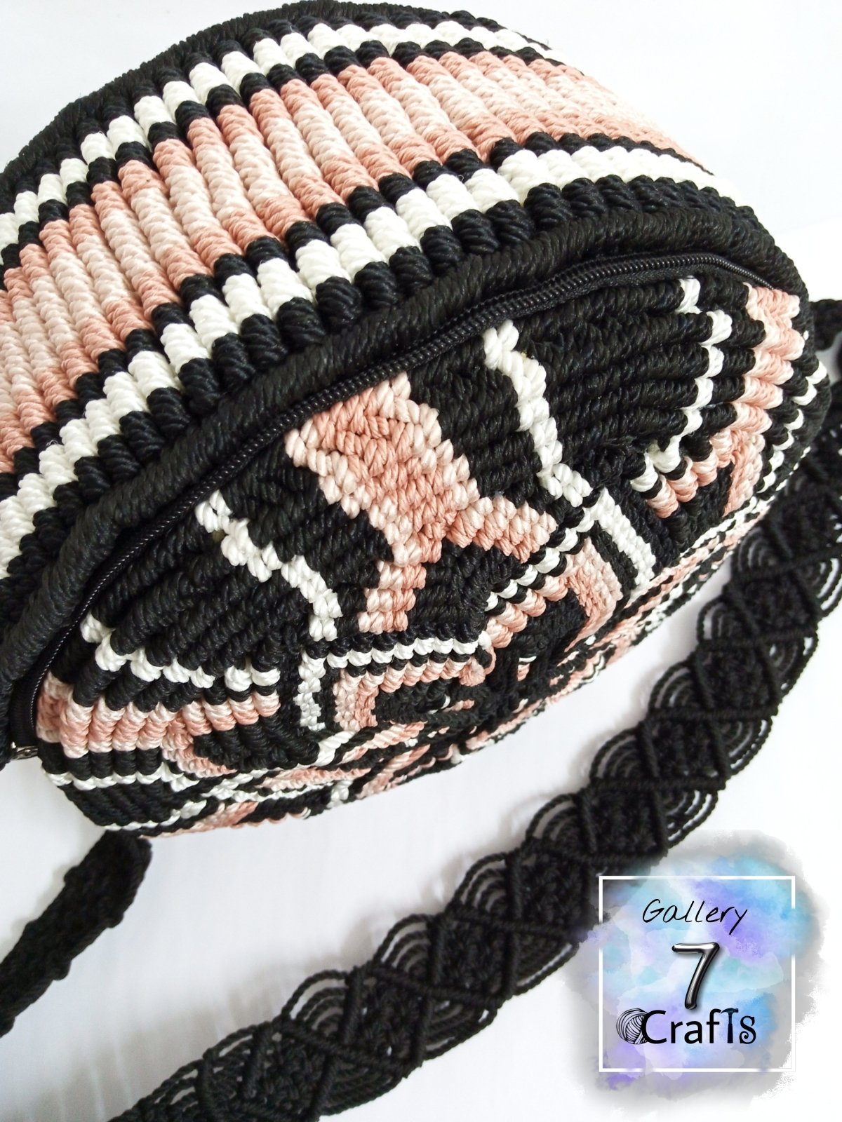Women's circular bag made with distinctive macrame knots, diameter 25 cm, lined from the inside, with a handle macrame designed to fit the appropriate length for you.