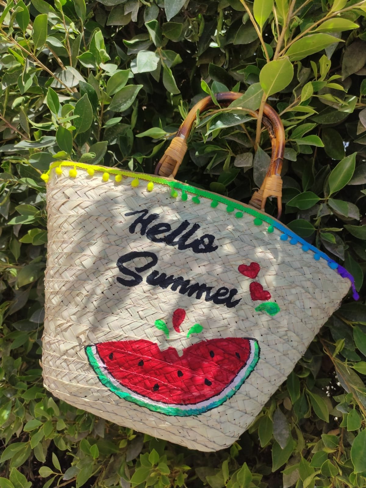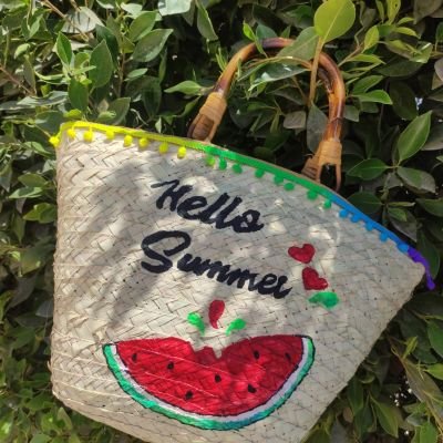 Beach bag made of wicker, hand painted in acrylic colours