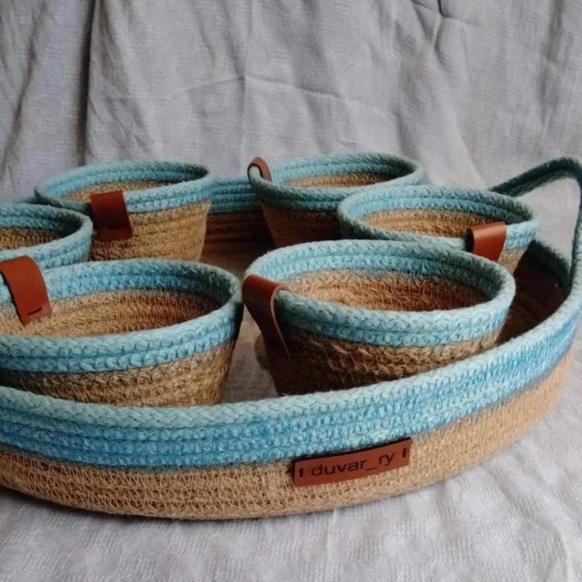 It consists of a tray + 6 plates + a glass plate (for the solid base ) Size :Bowl 8cm*5,5cm Tray 33cm *7cm Made of jute and cotton rope You can choose your favorite color instead of yellow or baby blue Available colors white, black, yellow, mint green, red, baby blue, gray, dark gray, lavender