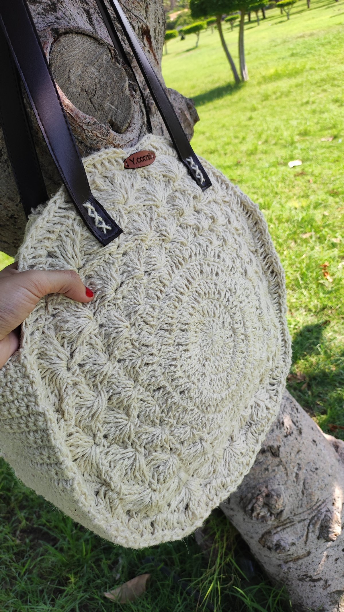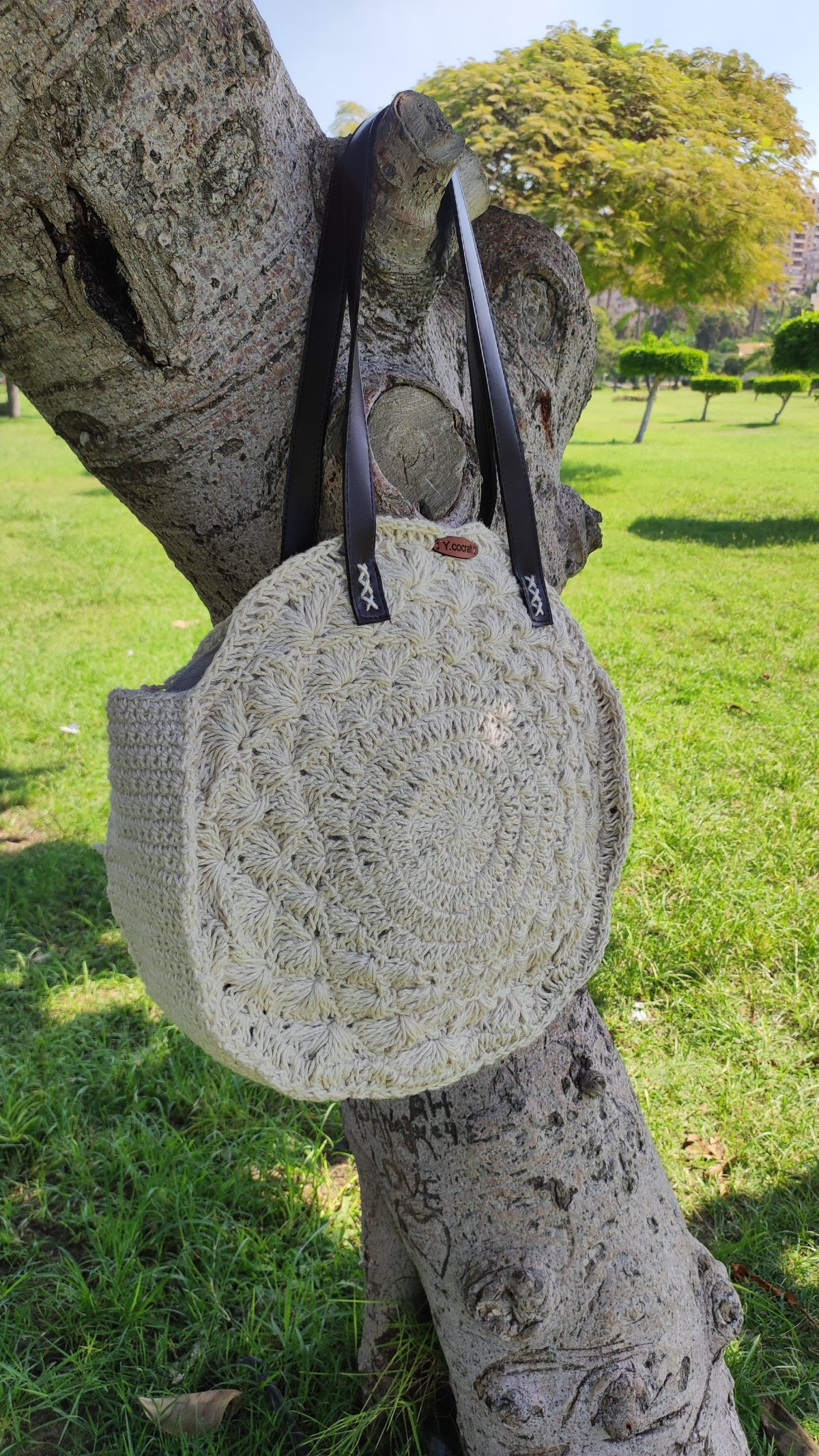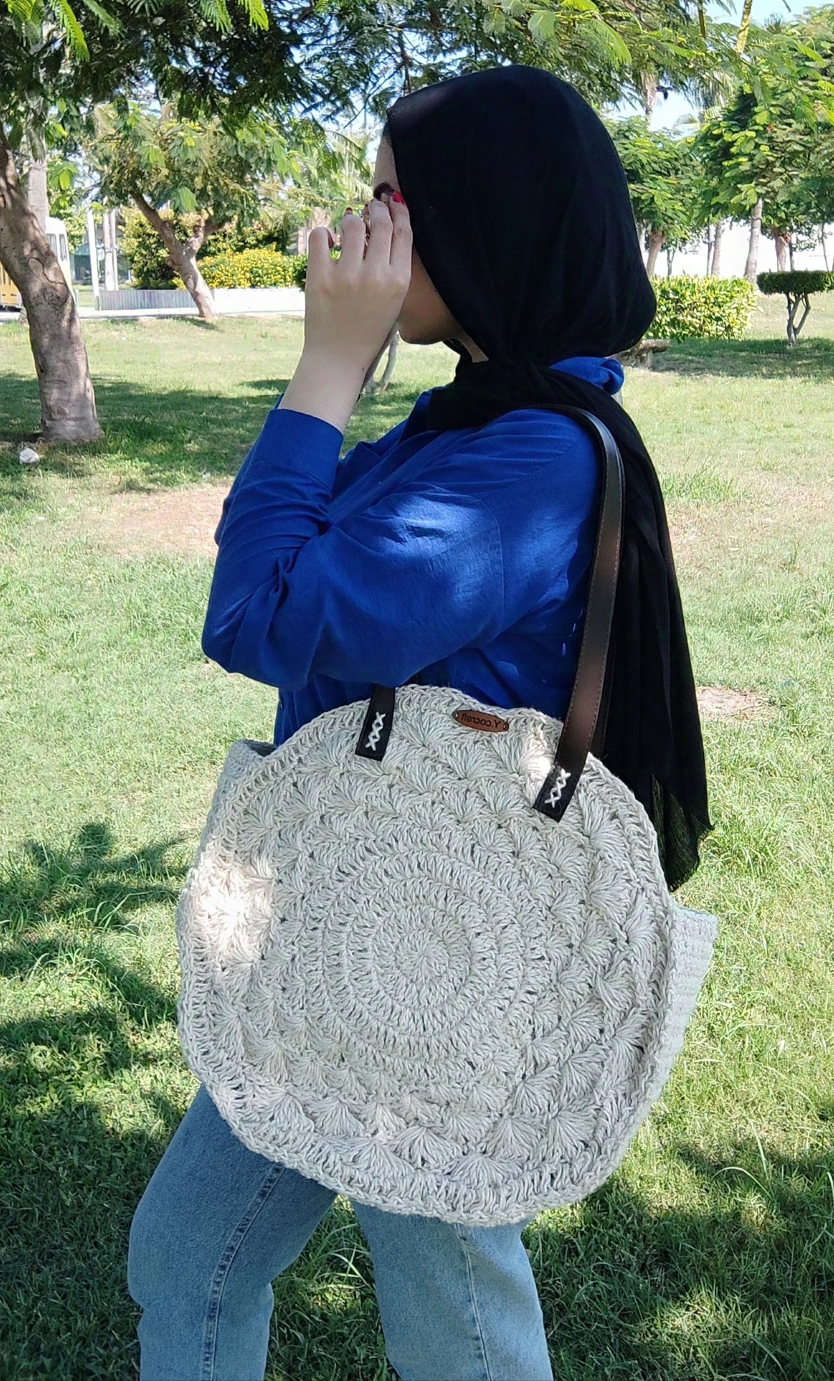 Round crochet bag with off-white burlap and leather handle, diameter 40 cm and depth 20 cm