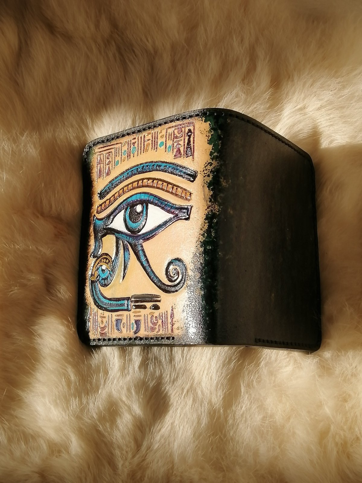 Men's wallet with a raised design of the Pharaonic Eye of Horus. The wallet has 7 pockets: 4 for cards, 1 for cash, and 2 hidden compartments. Made with high-quality cowhide leather, it features a mix of colors: blue, black, and navy.