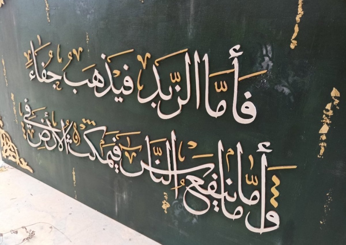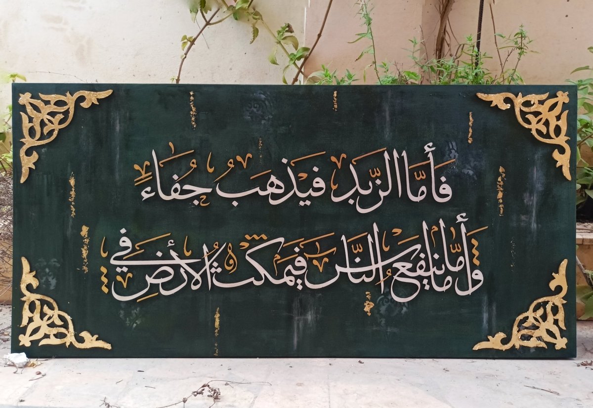- Hand painted abstract canvas with embossed Arabic calligraphy - 60*120 cm - Embossed ornament with gold leaves
