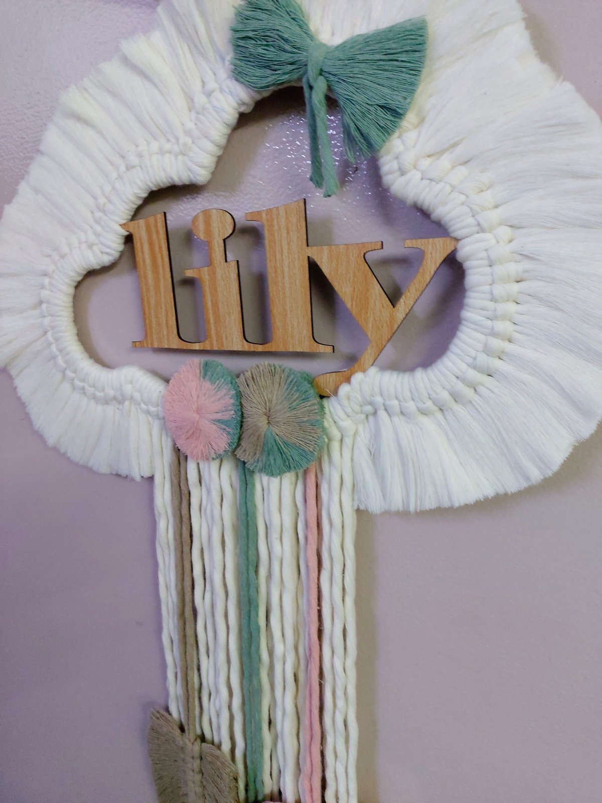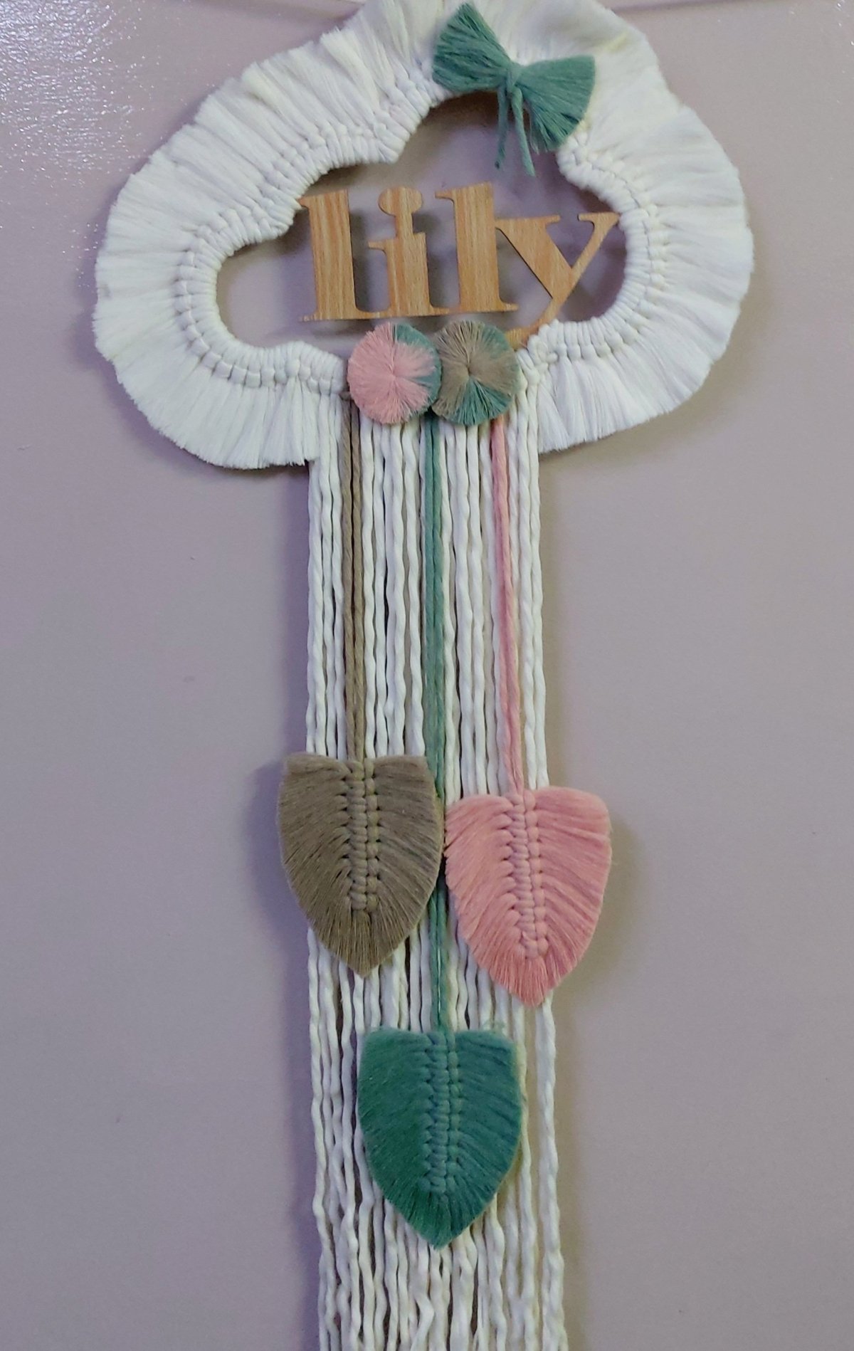 Cloud macrame wall hanging by specific name for decore , kids room , birthday from very soft macrame cotton threads Size Cloud (wood) : 30 cm Totall length : 120 cm Total width 40 cm Can change size , colour , name by order
