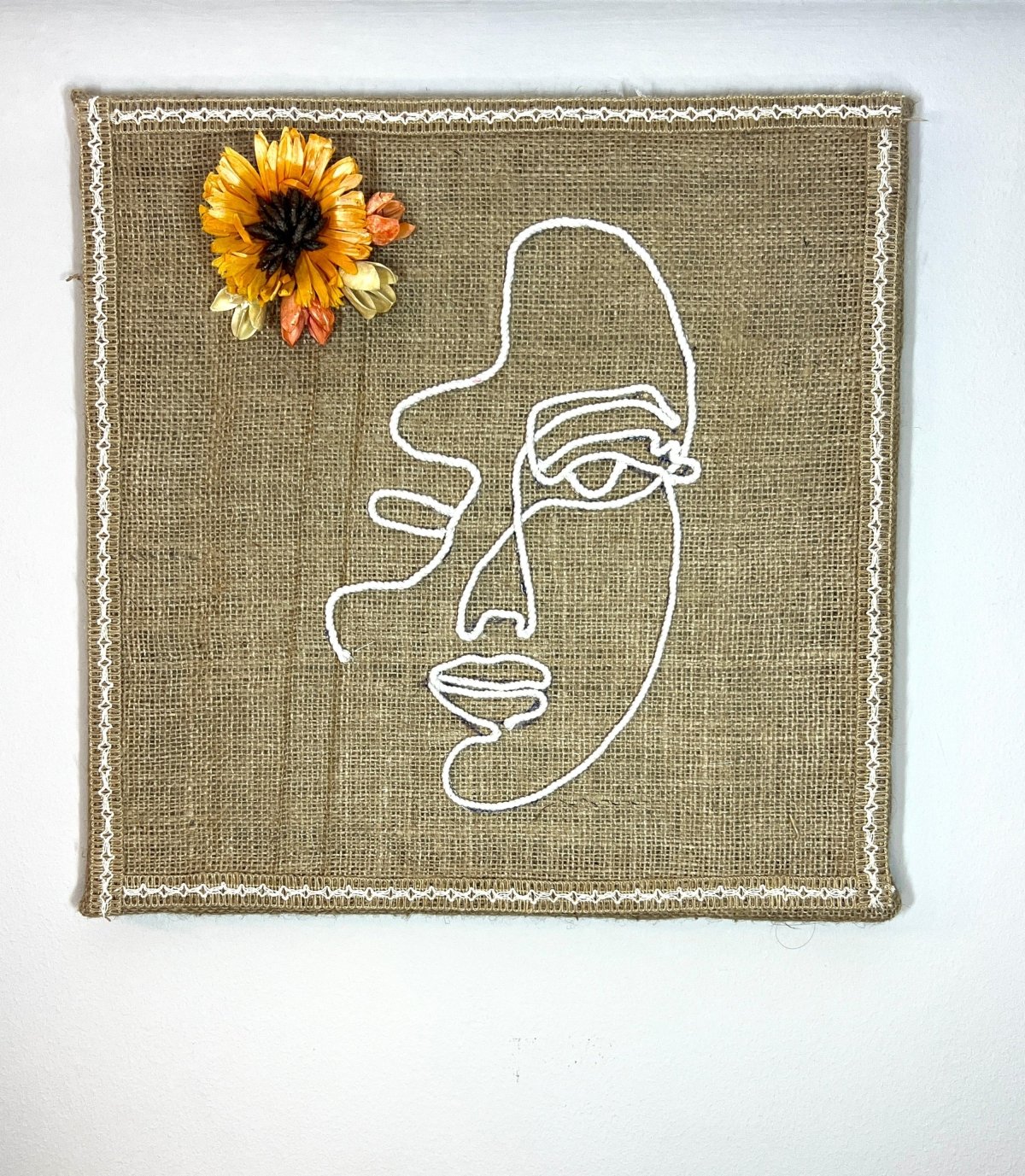 burlap wooden frame, size 40x40 , using braided thread & flower