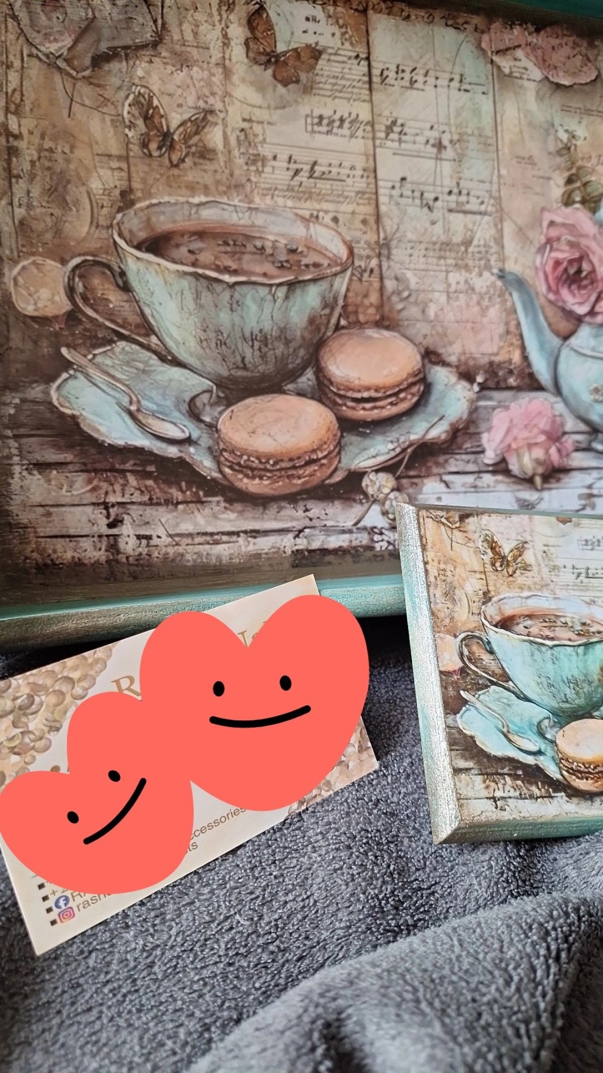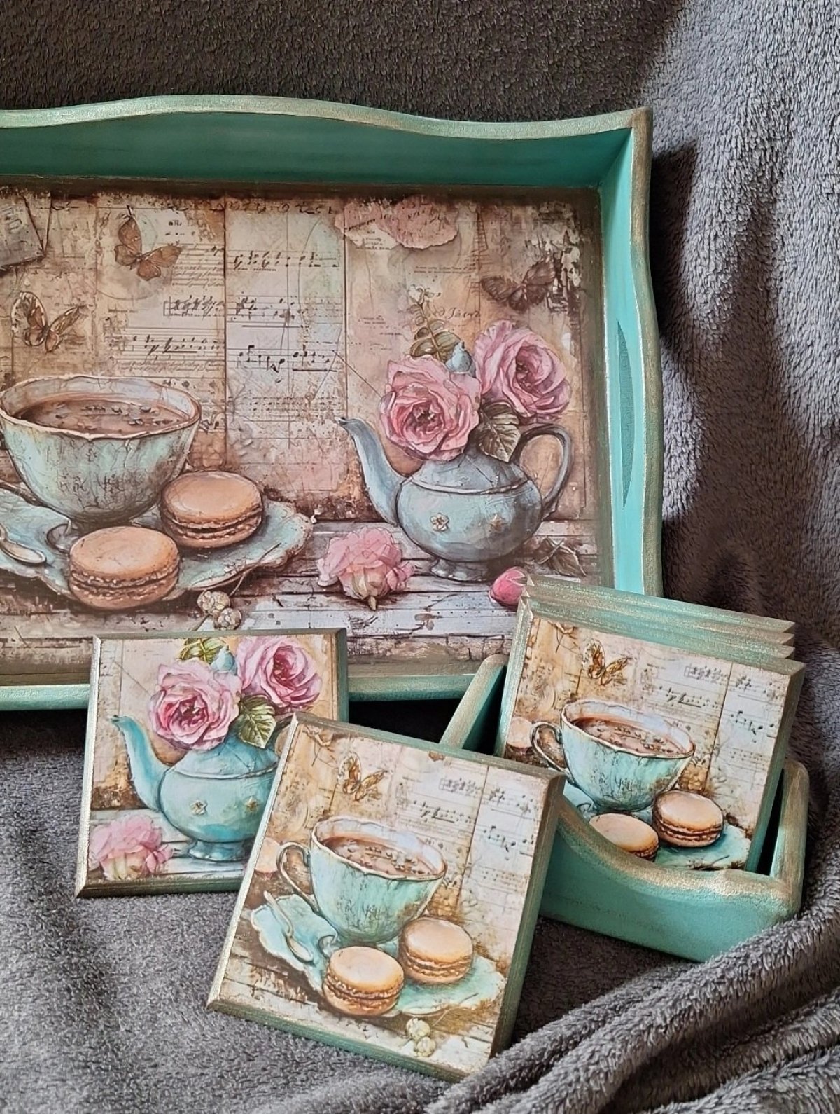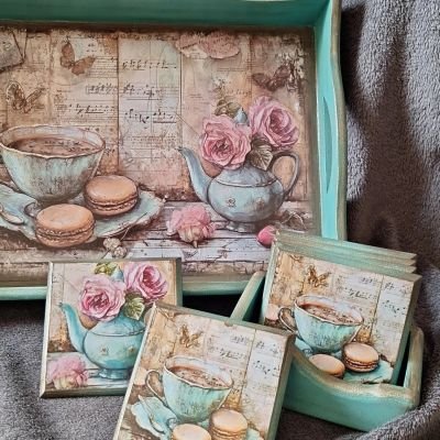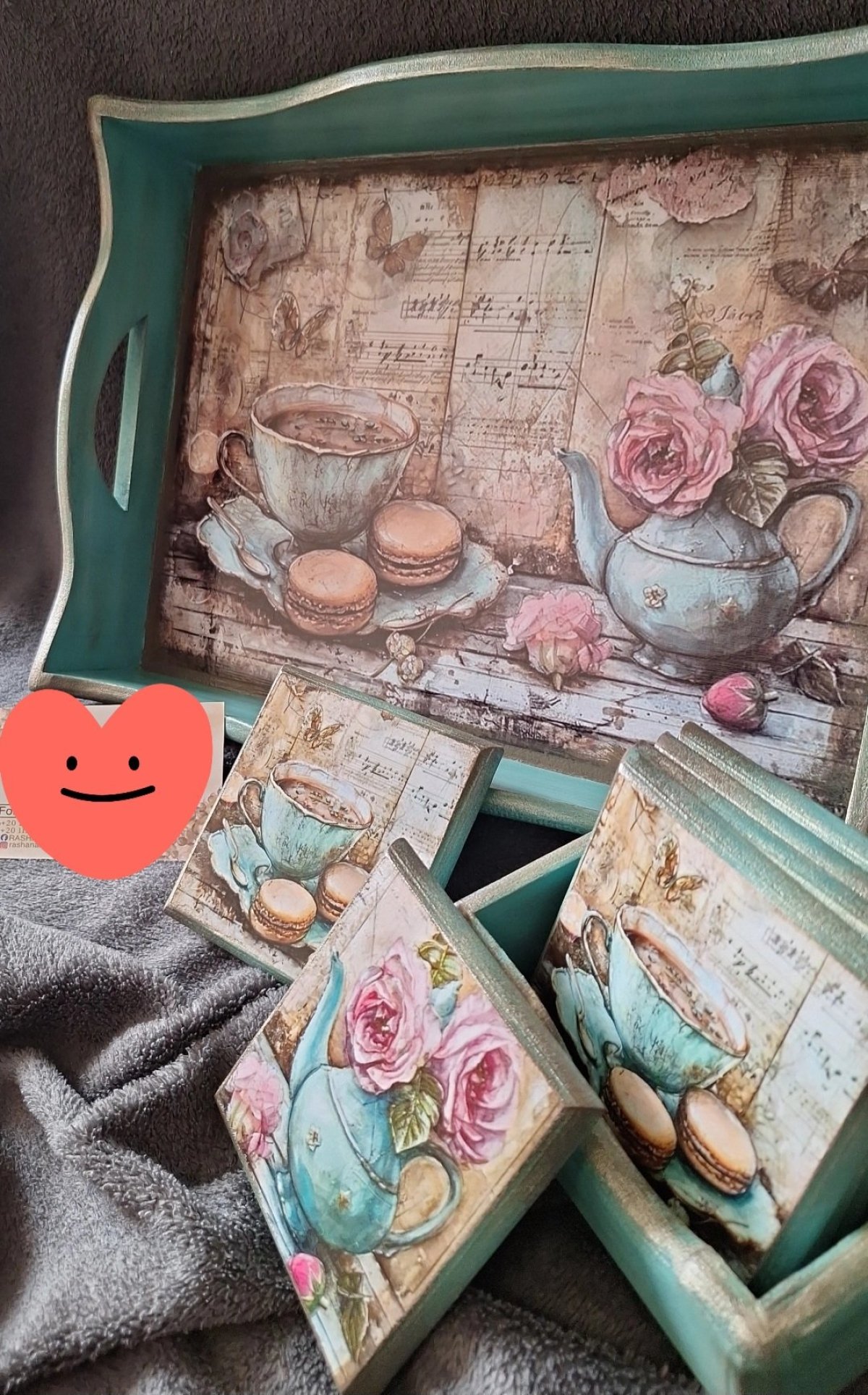 Wooden tray set with coasters. The tray is 25 x 35 cm in size with 6 coasters, 10 x 10 cm in size.
