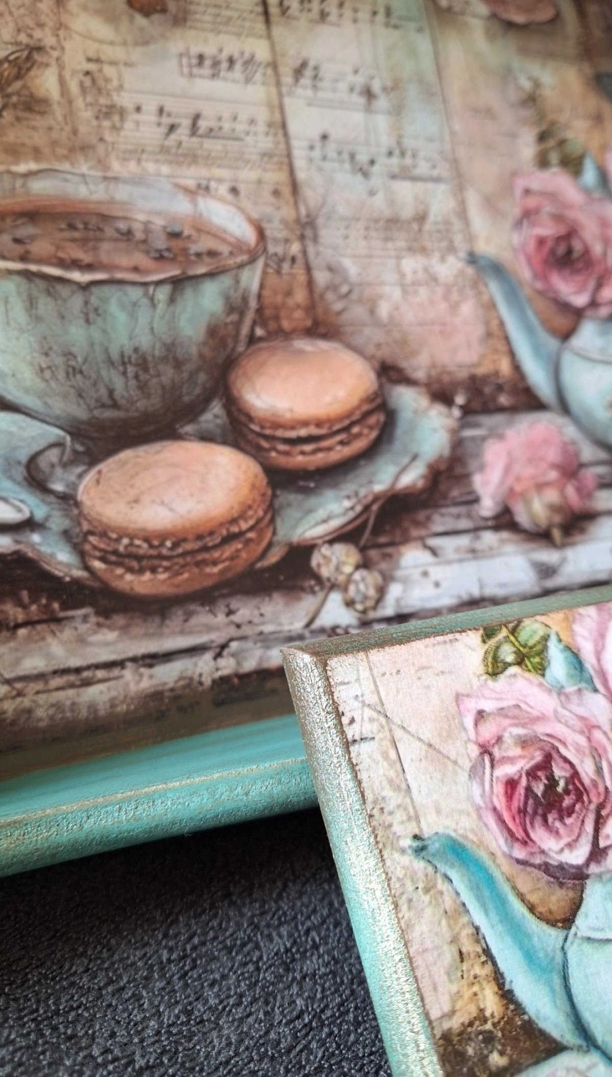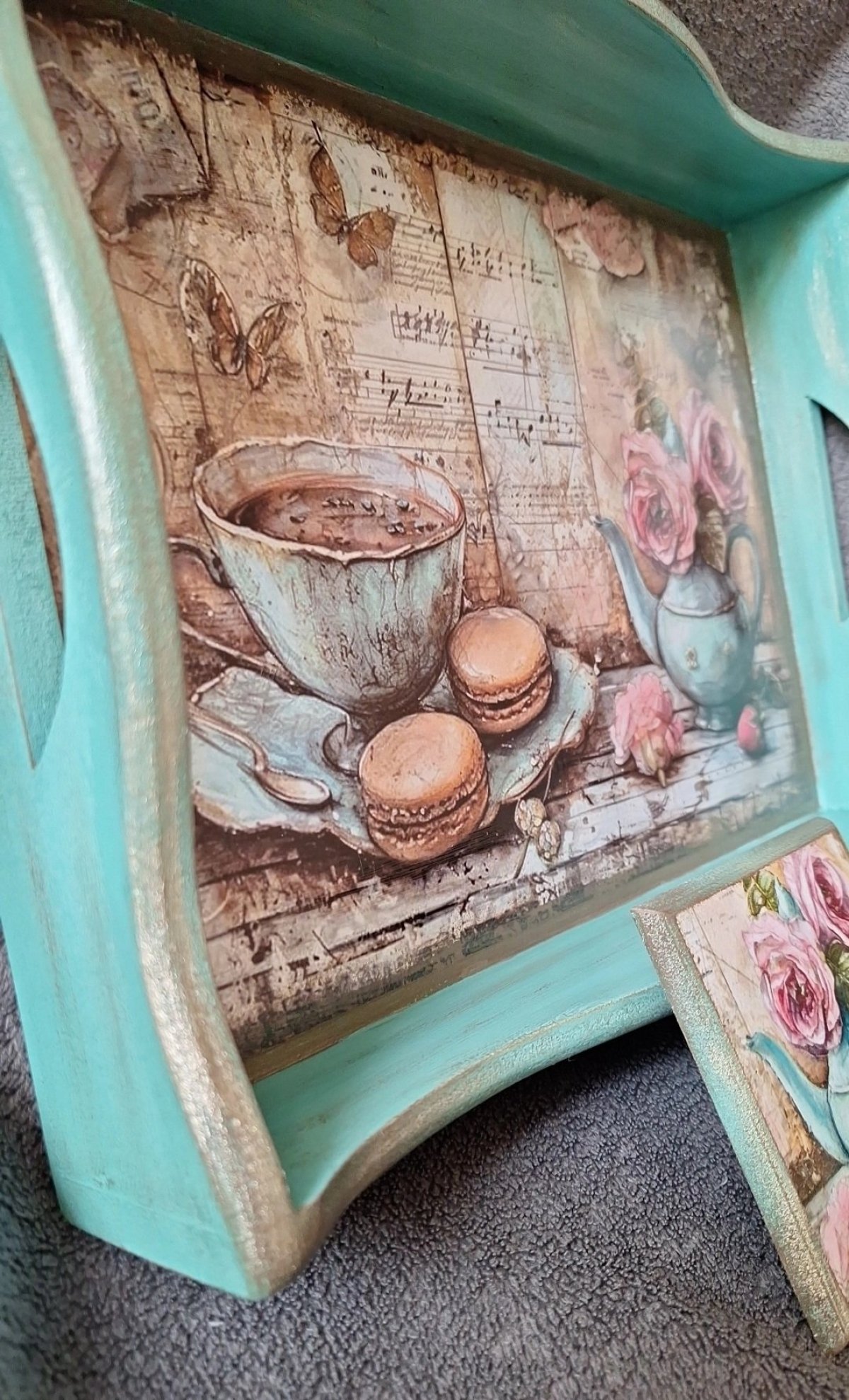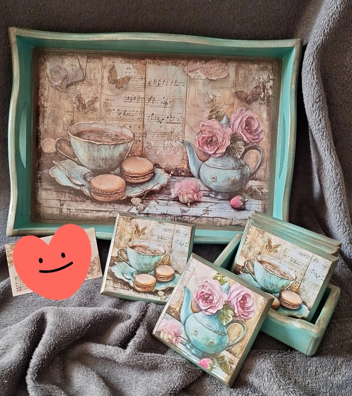 Wooden tray set with coasters. The tray is 25 x 35 cm in size with 6 coasters, 10 x 10 cm in size.