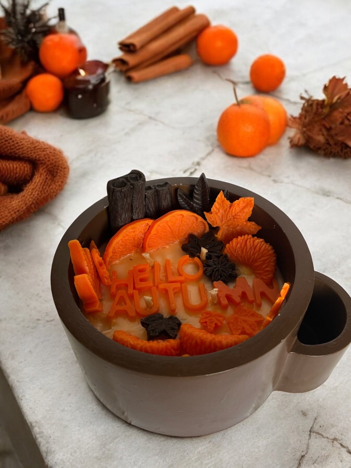scented candle 450 gram pure bees wax large scented candle in fall spice scent (orange , cinammon) decorated with wax in shape of orange slices and leaves in concrete pot