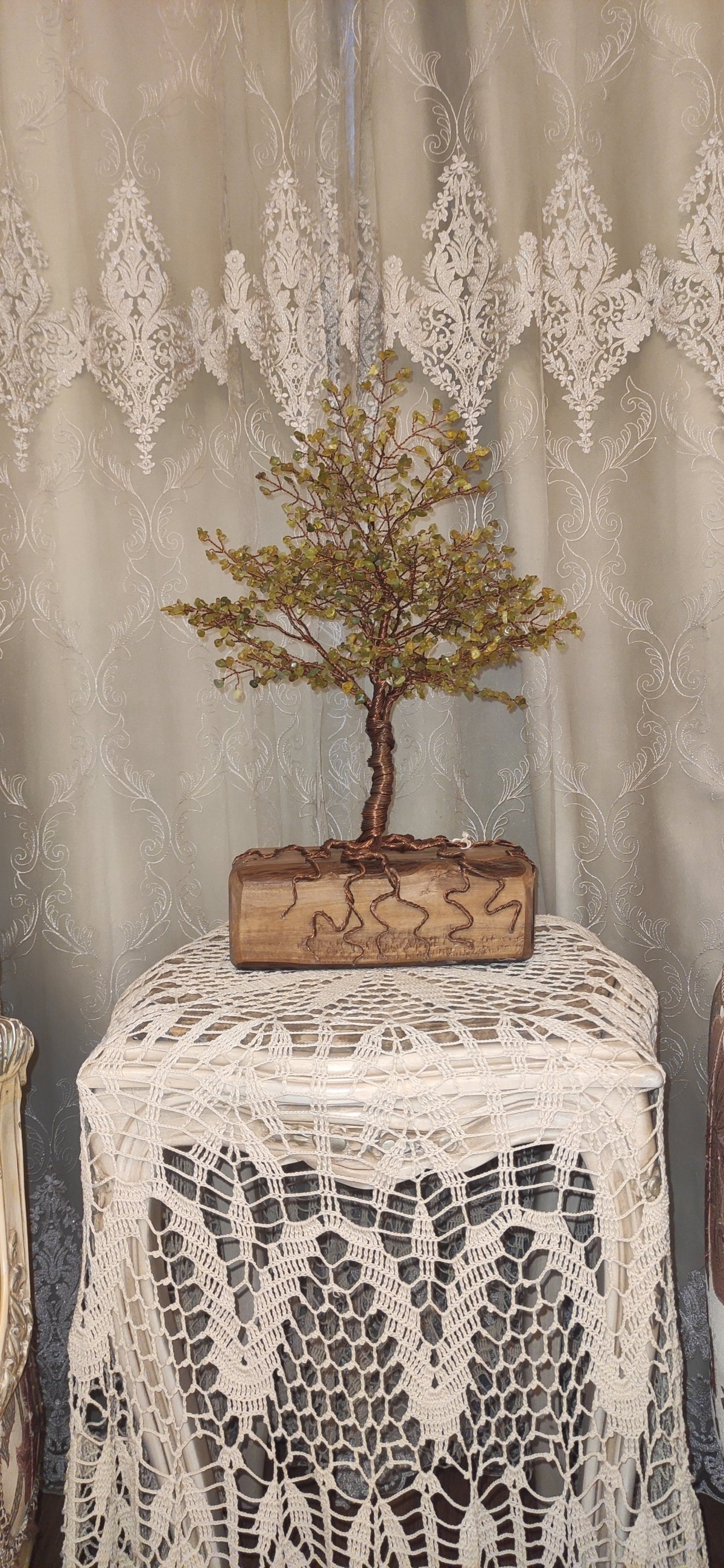 Handmade copper tree with peridot natural stones stands on olive tree roots base Length 50 cm