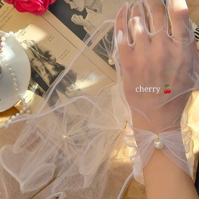 A simple design of gloves made from delicate tulle fabric, adorned with a pearl embellishment, available in any color of your choice.
